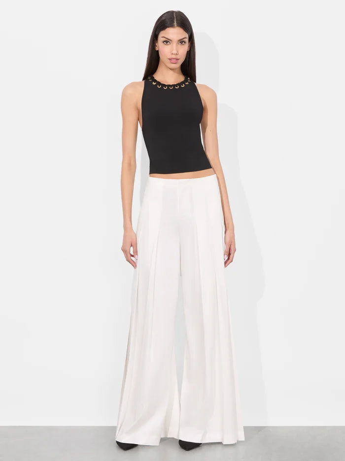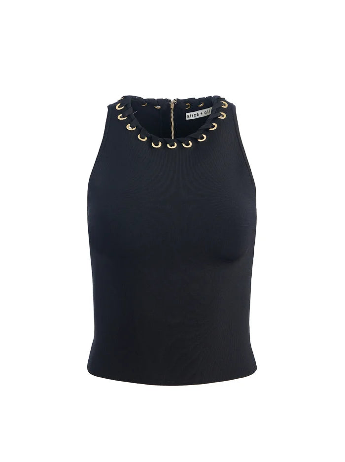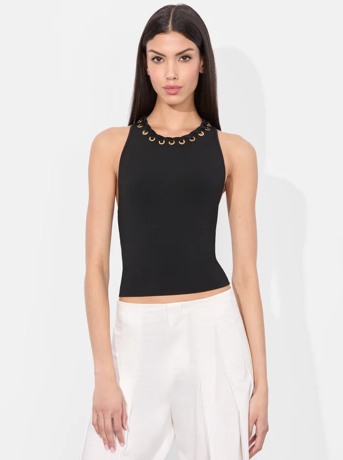 Your go-to tank just got a major upgrade. This sculpting knit top is crafted from a thick, supportive bandage material that hugs you in all the right places. The high neckline is finished with gold grommet hardware for a touch of edge, while the racerback silhouette keeps it sleek. It’s form-fitting, flattering, and an easy swap for your go-to basic tank when you want a little more wow factor.