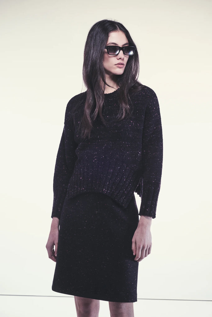 SOFT-FITTING CASHMERE CREW-NECK SWEATER WITH LONG SLEEVES AND MÉLANGE TEXTURE. STRETCH HEM WITH PULLED EFFECT THAT SHORTENS THE FRONT COMPARED TO THE BACK. CROPPED LENGTH ABOVE THE HIPS.