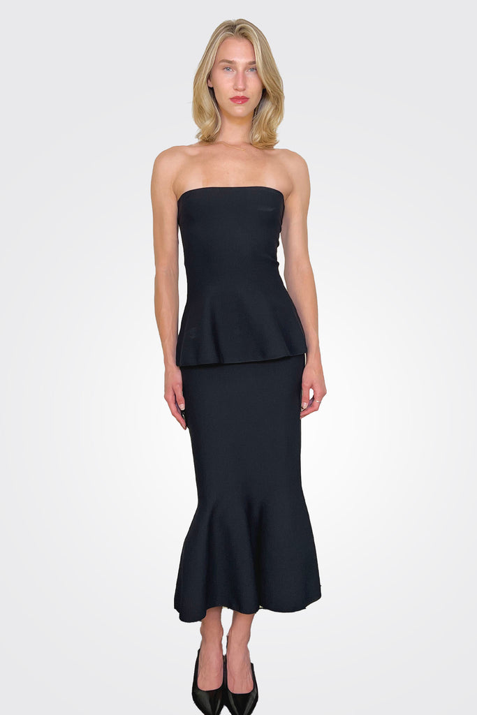 TOP IN TECHNICAL NYLON, BANDED MODEL WITH GODET, FITTED BUST AND FLARED HEM WITH SCULPTED FOLDS.