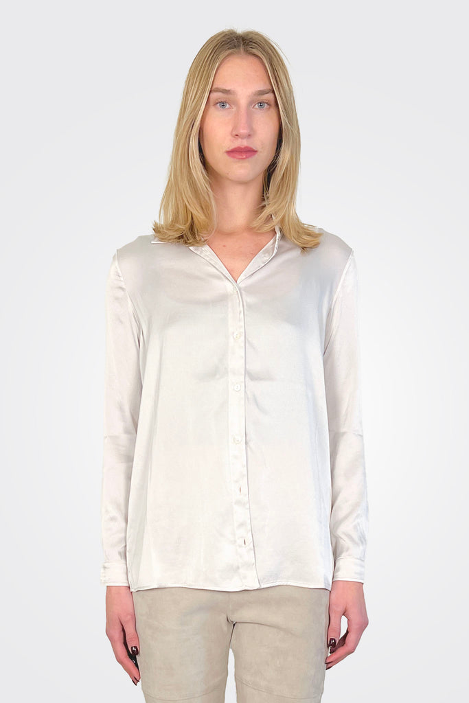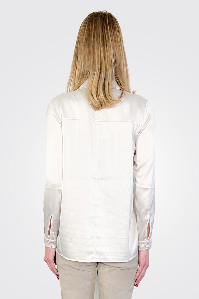 Regular-fit shirt. Made of stretch silk satin. Italian collar, buttoned cuffs, and back yoke. Garment dyed.
