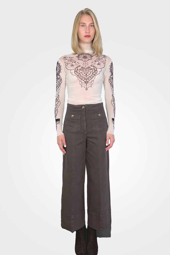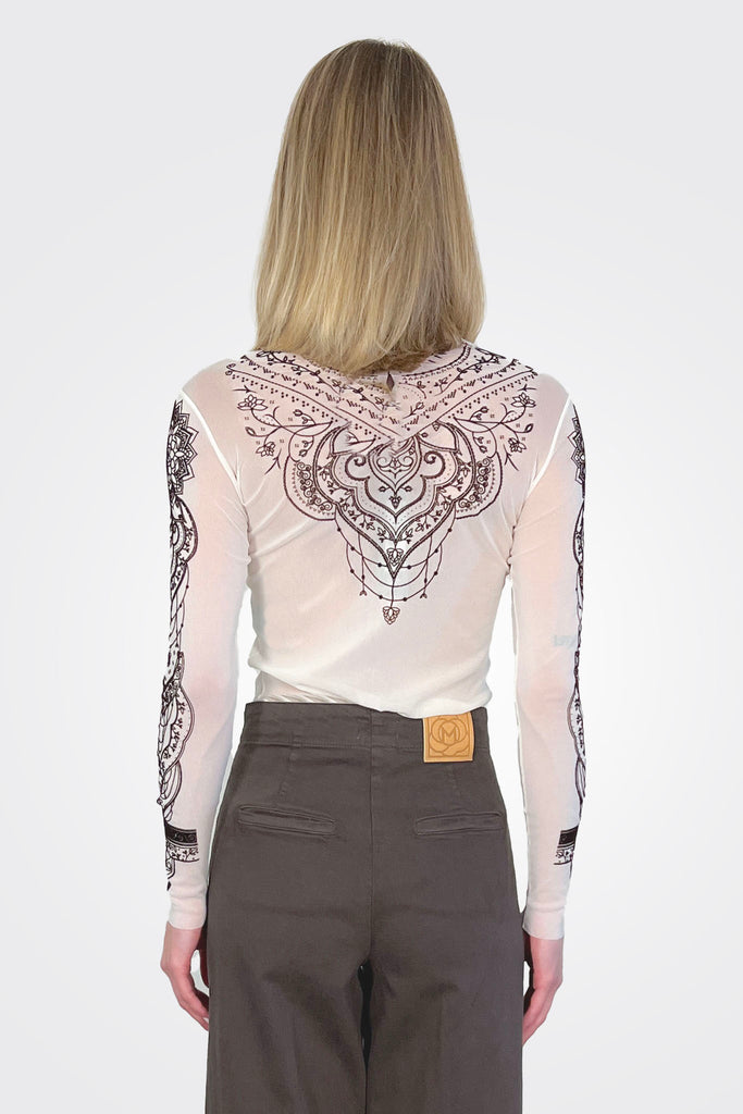 Stretch tulle single layer top that features an embossed suede henna tattoo print on front and back