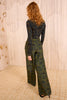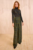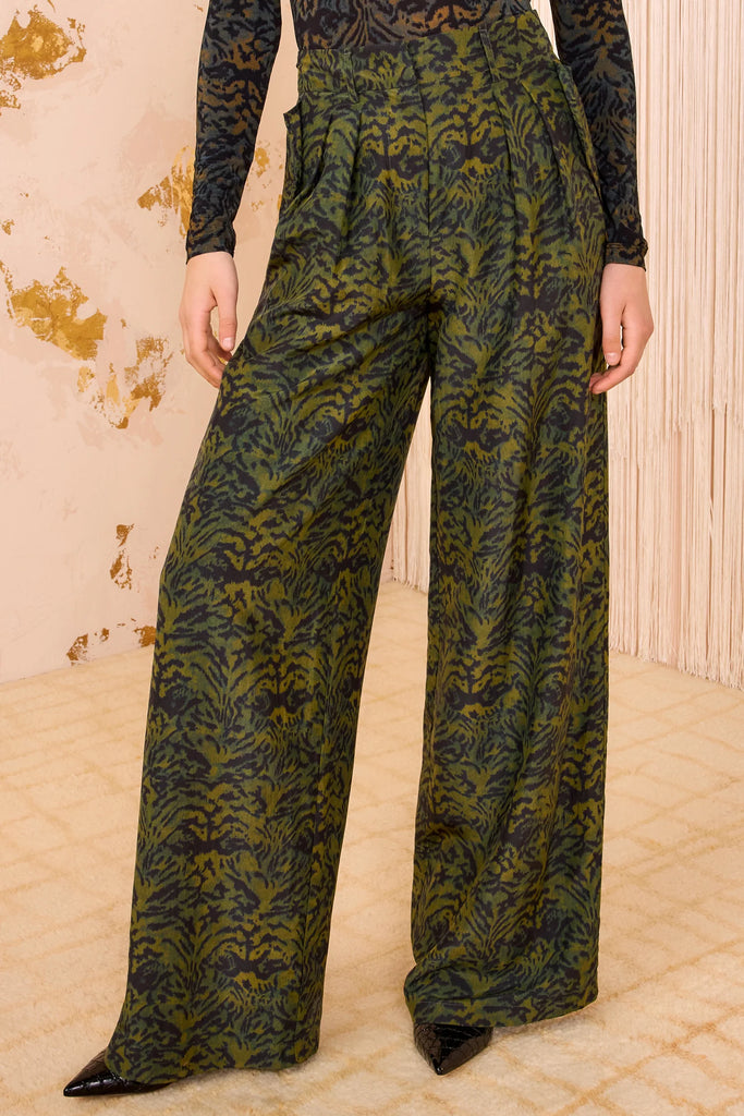 the Charlie Pant is cut from lightweight habotai fabric with a lustrous, taffeta finish. Graphically adorned with an ikat-inspired animal print and shadowed textures, this dark green pant is an elevated version of a classic trouser silhouette.