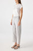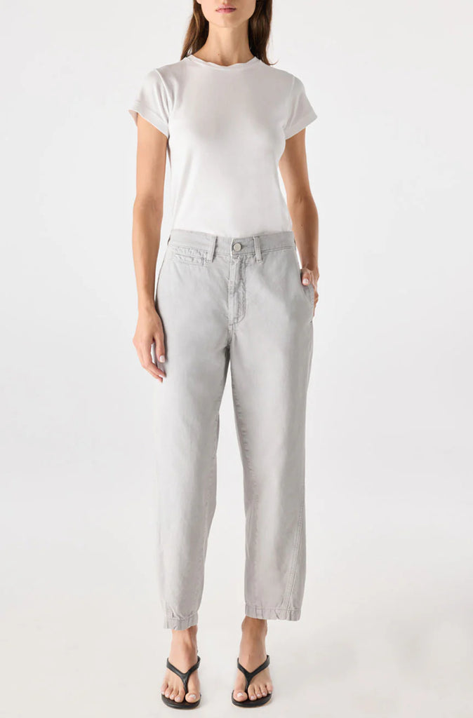Mid rise, loose fit trouser with a curved outseam, cropped leg, and let-down hem for a vintage-inspired feel.