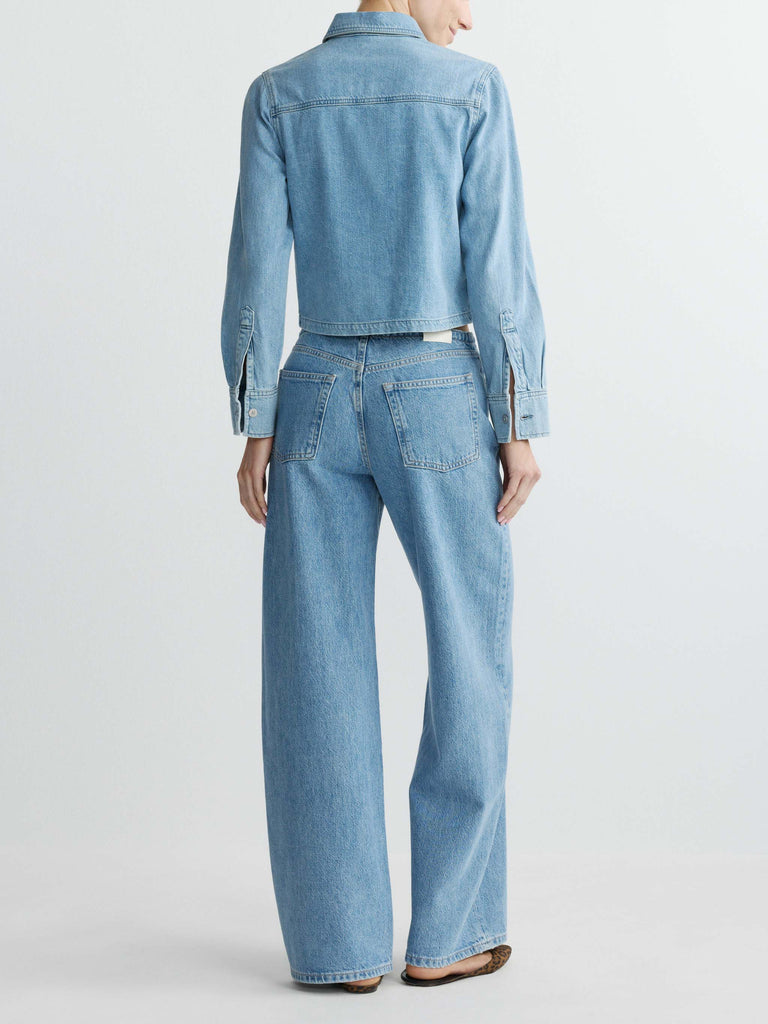 River Aura is a classic, mid-indigo wash with subtle sanding throughout. It features a silver shank, copper rivets, khaki stitching, a clean hem and an ecru back patch.