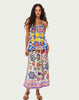 Vanessa midi skirt featuring bold "This is ME SHOW" lettering surrounded by printed flowers in blue, pink, purple, and orange. Sharp geometric cube patterns and yellow smiley faces scatter throughout, while decorative borders frame the hem.