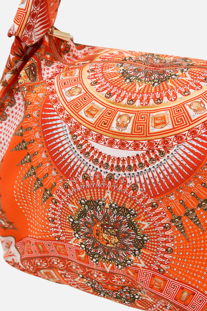 Designed in Australia, The Obelisk Gate Slouch Shoulder Bag unearths the opulence of Dendera and Hatshepsut’s divine legacy. Adorned with heiroglyphs, majestic golden arches, and the Eye of Horus set against a rich burnt sunset backdrop Lovingly handcrafted, this luxury shoulder bag features a relaxed slouchy silhouette with a wide shoulder strap tied in a loose knot detail at either end. The lavish zip enclosure ensures your treasures are stored securely while shimmering crystals add an opulent touch.