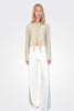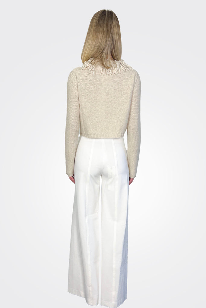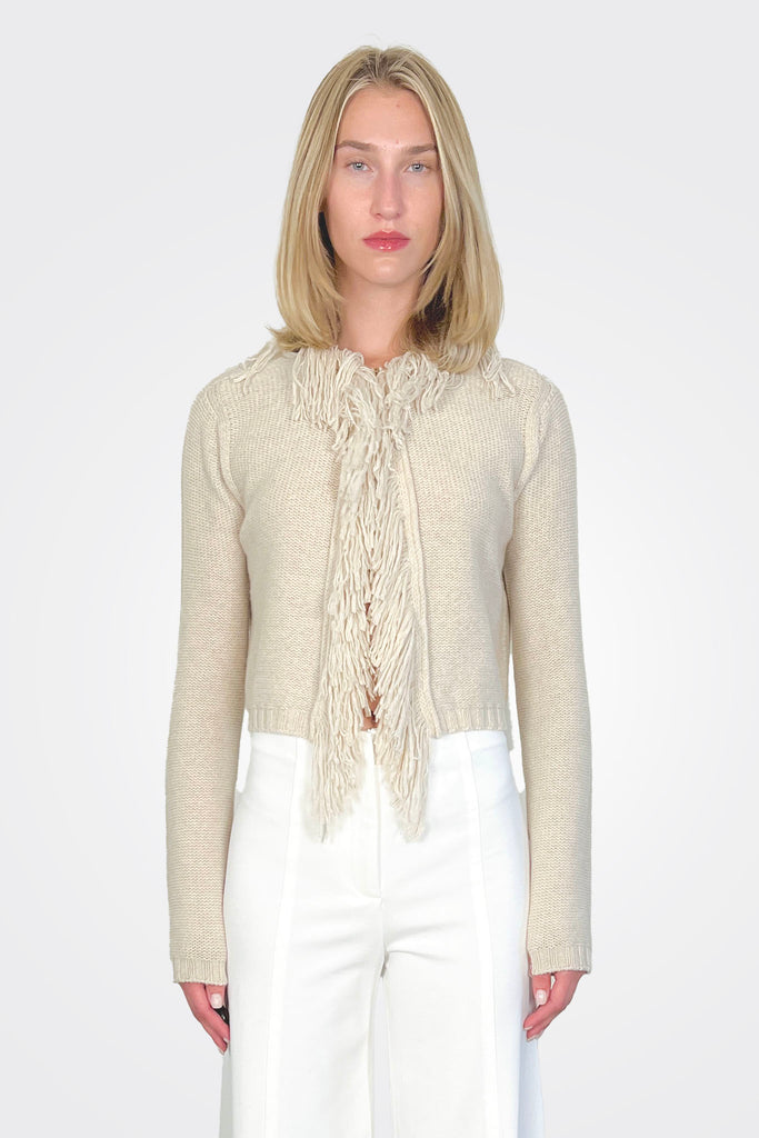 CROPPED LONG-SLEEVED CARDIGAN IN CASHMERE AND SILK, WITH A TIGHT, FINE KNIT. COLLAR DECORATED WITH TONE-ON-TONE FRINGES THAT EXTEND ALONG THE ENTIRE FRONT TO THE BOTTOM. WAIST-LENGTH, SEMI-FITTING.