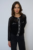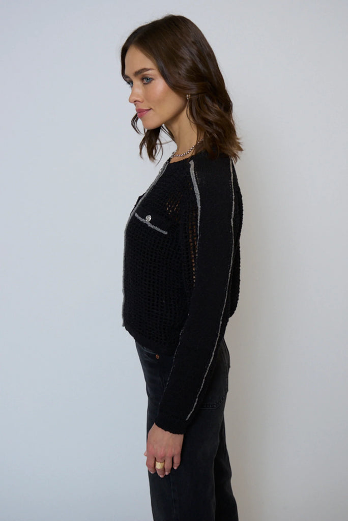 - This stylish cardigan features a unique open mesh knit with contrasting trim details.