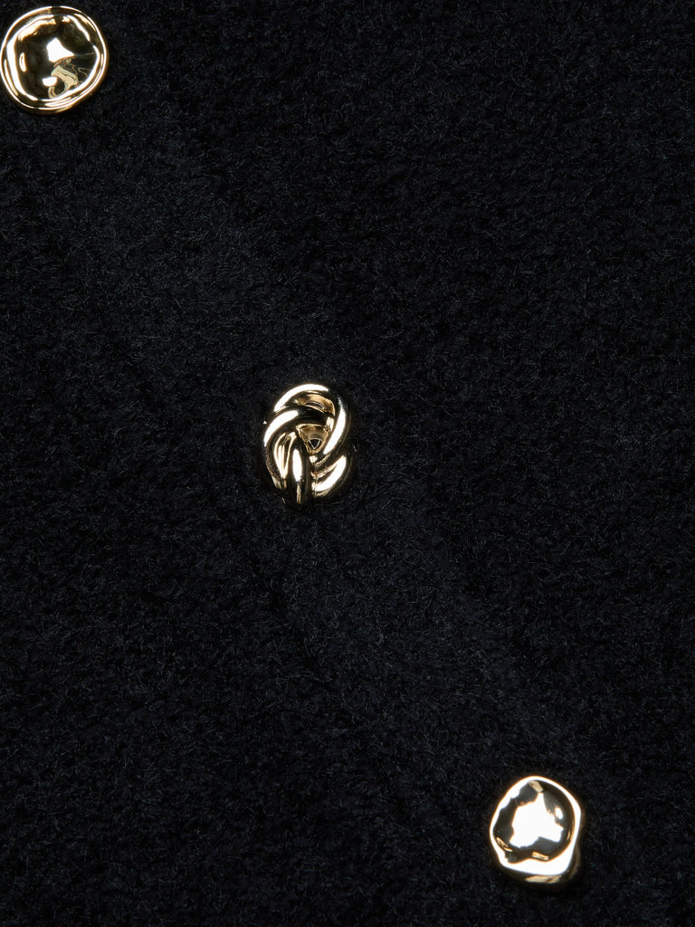 The Melissa cardigan blends soft structure with quiet elegance. Spun in a textured knit, it’s shaped with a sculpted waist and flared hem that flatters the figure. A clean neckline and graceful silhouette channels elegance with a hint of old-world charm while novel accent buttons keep it thoroughly modern. Wear with its coordinating skirt and heels for a polished head-to-toe look.
