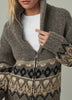 A traditional fair isle refreshed in a relaxed fit shawl cardigan with zipper front closure.