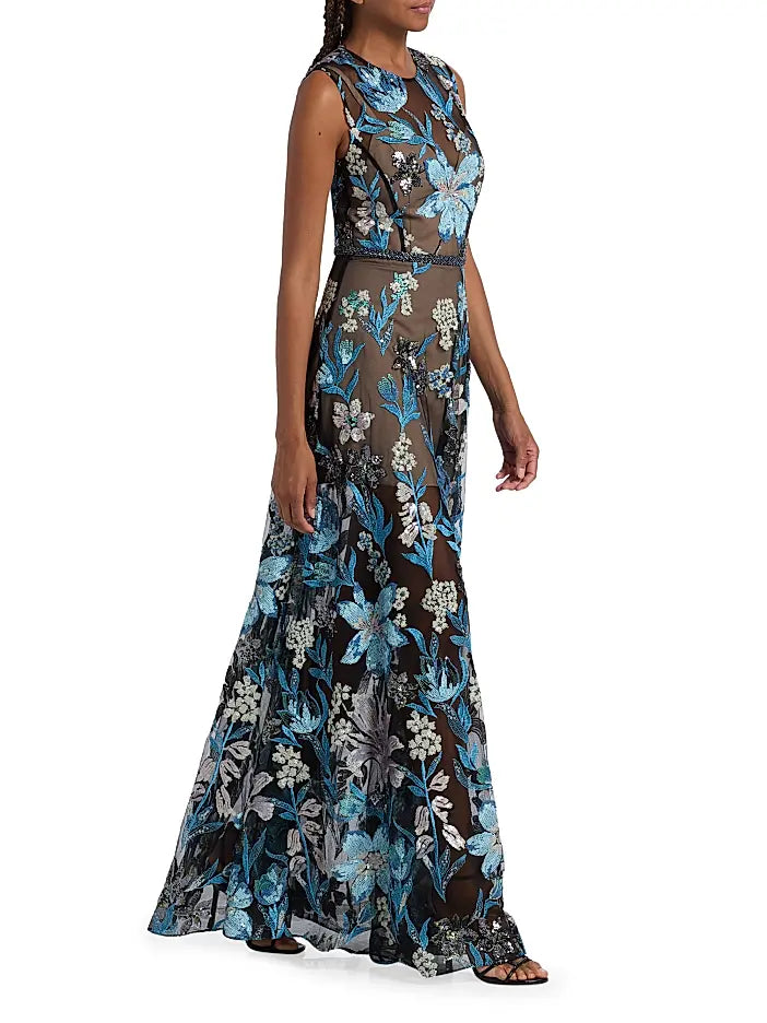 Bronx and Banco's Arielle gown showcases intricate sequin-embroidered florals on semi-sheer mesh. Cut for an A-line silhouette, this style features an illusion sweetheart neckline and a braided belted waist.