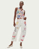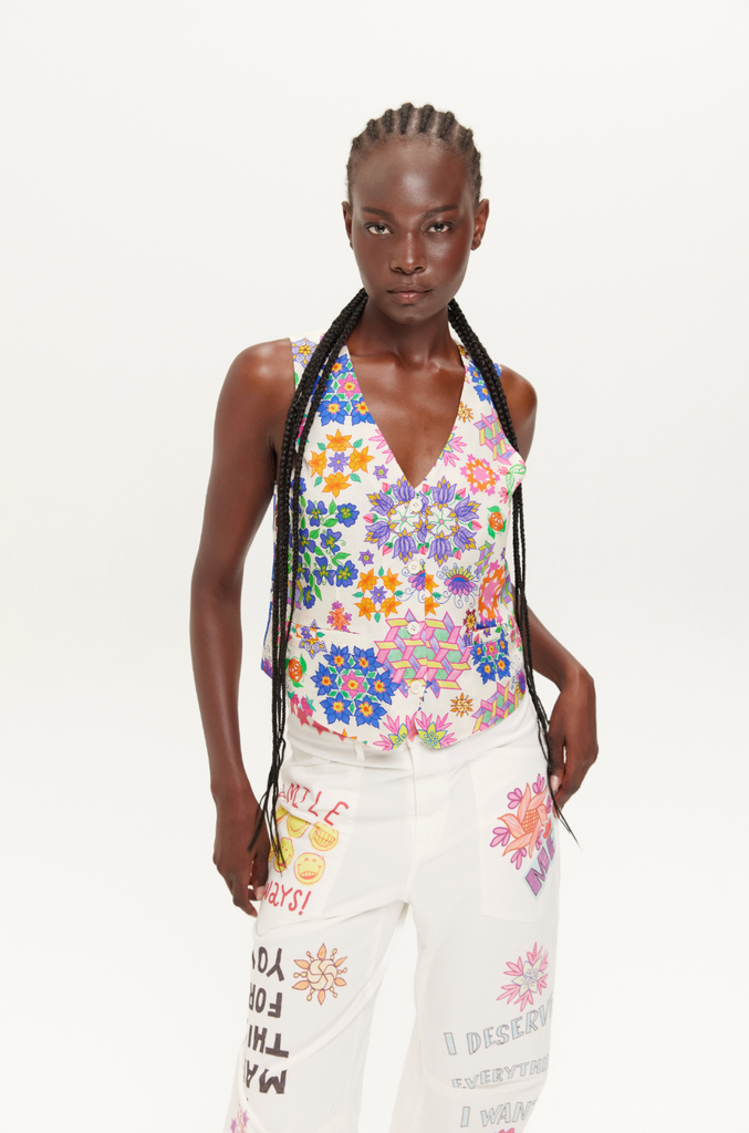 Express joy with the Cameron vest from our Markers collection, featuring bold hand-painted florals in blue, orange, pink, and purple across a cream base. Large geometric mandala shapes blend with organic botanical motifs, while tassel trim adds playful detail at the hem.