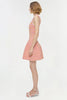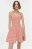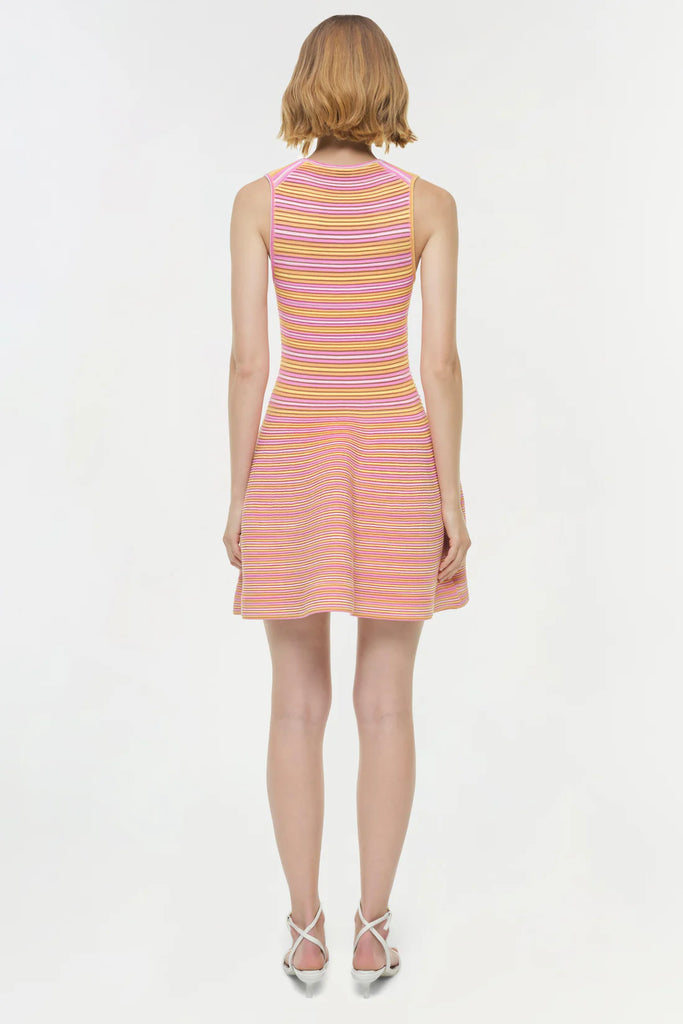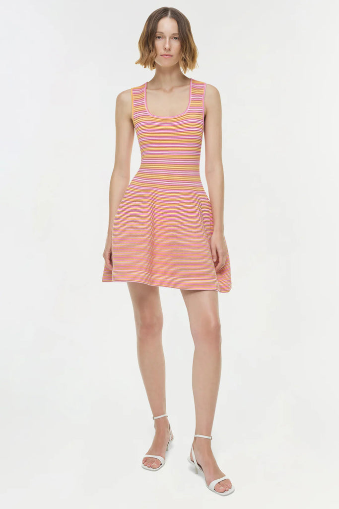 The Cally Mini Dress in Citrus Multi. This scoop-neck mini dress is made from space-dyed knit and is crafted with structured, voluminous pleats that flare out to create a flattering, sculpted silhouette. The defined pleating adds movement and a modern edge to the design.