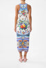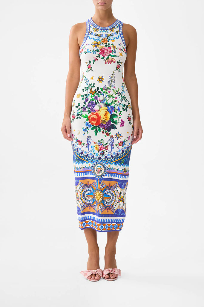Designed in Australia, the Tiles Darls Jersey Tank Dress reads the language of florals and tiles, blue and orange hues intertwine, a celebration of artisan hands and enduring beauty. Lovingly handcrafted, this luxury jersey midi dress showcases a fitted silhouette that caresses your curves and falls to mid-calf length. A bodycon sleeveless style with slightly lowered armholes, a scooped neckline and slight racer back ensure everyday wearability.