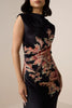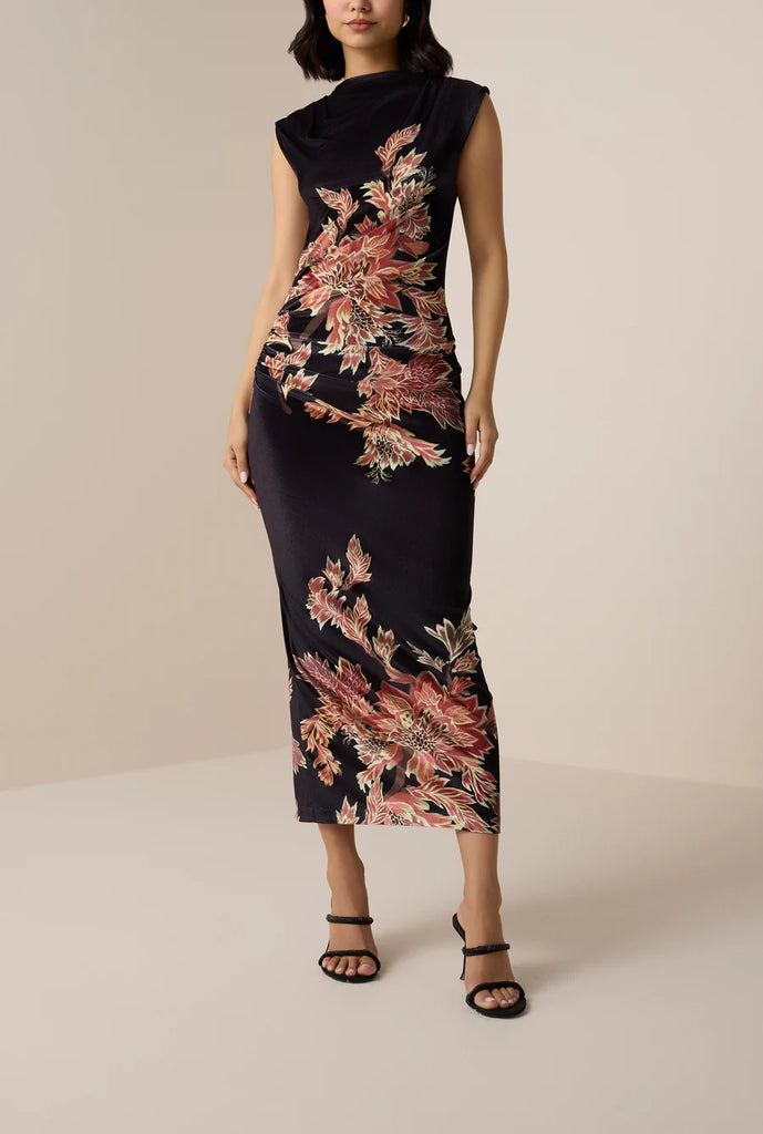 The Johi Cowl Neck Midi Dress is an ode to understated evening glamour. Crafted from sumptous polyester velvet knit lycra, it features a sleek black contemporary baroque print. The elegant cowl drape neckline flows into extended shoulder sleeves, lending a refined yet modern edge. Designed for a fitted look, this midi dress skims the body, while the back zipper closure ensures a clean seamless finish.