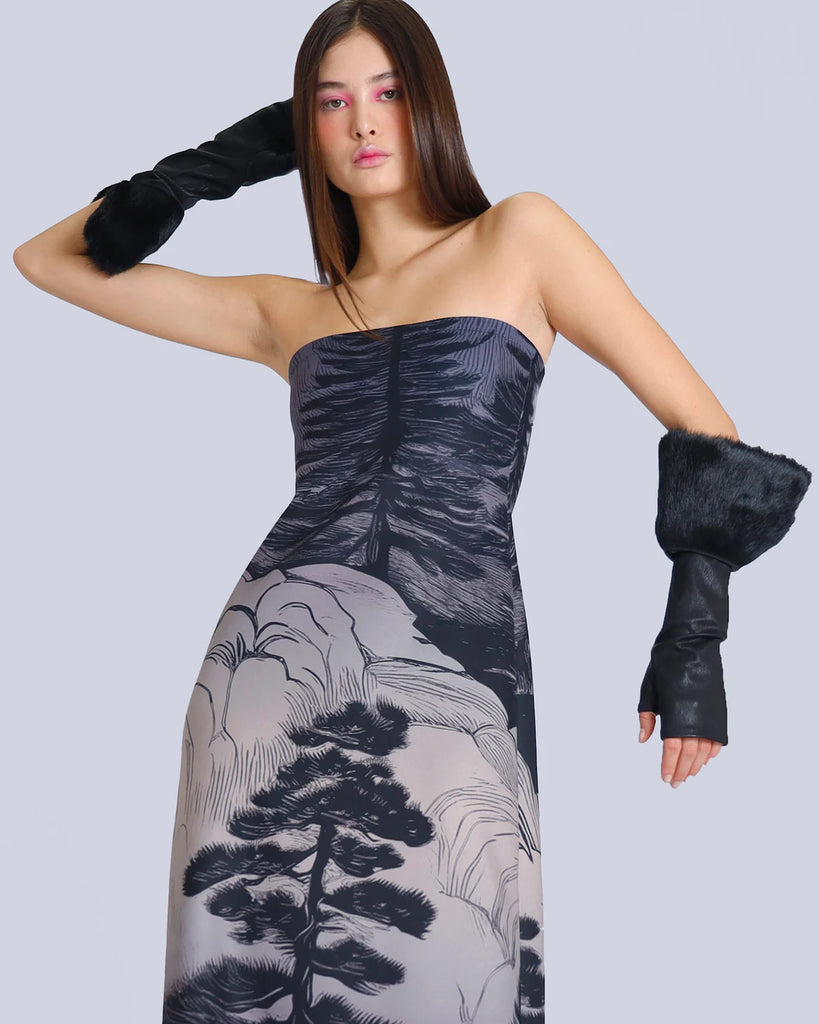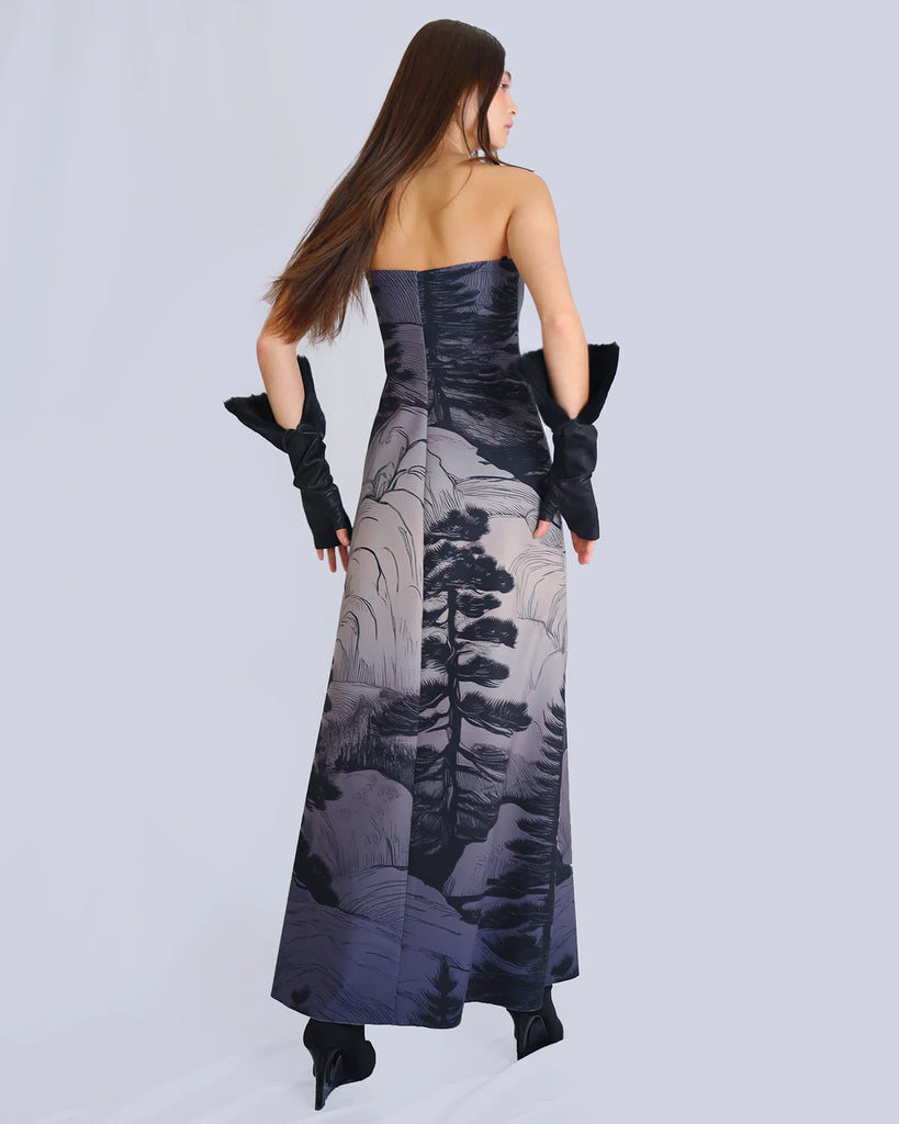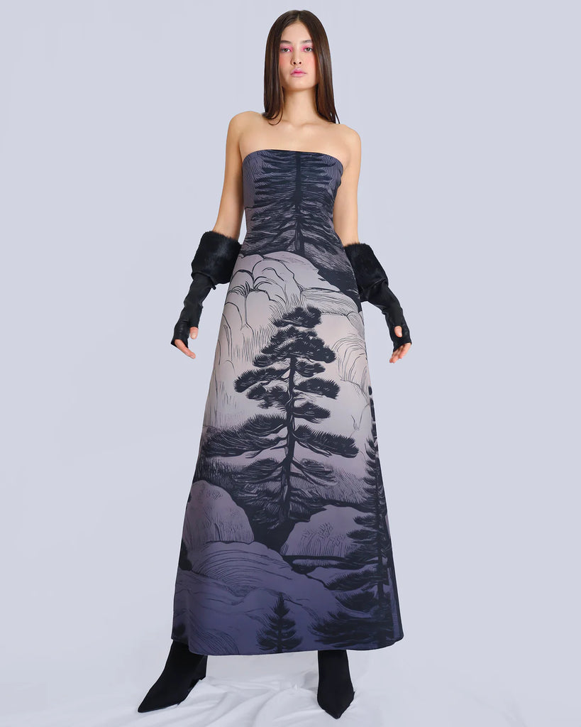 The Nancy dress redefines evening elegance with structure and ease. Its exclusive Winter 2025 printed jersey, bonded with fine scuba, smooths and flatters the figure while offering sculpted comfort. The fitted bustier transitions seamlessly into an A-line skirt, creating a refined, flowing silhouette — a true Maison Marie Saint Pierre statement. *Print placement may vary