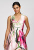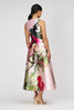 The Regina Tea Length Dress features a striking heirloom rose placement print with oversized floral motifs, making it a statement choice for special occasions. With an elegant overlap pleat detail at the neckline, it's the perfect dress for a wedding guest or a rehearsal look for the mother-of-the-bride.