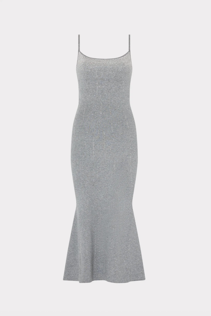 Cut from a festive high shine metallic fabric, the Ricky dress is designed as a curve hugging mermaid silhouette that flares out just above the ankles. Stunning, comfortable, and easy to wear.