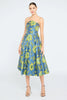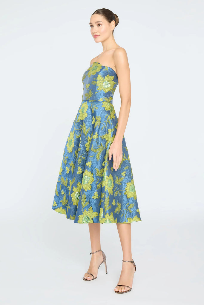 Bright, bold, and built to twirl. This strapless jacquard dress pops in vibrant florals with a scalloped neckline and flared A-line skirt. An exquisite choice for garden parties, cocktail receptions, and elegant summer weddings.