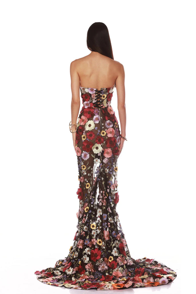 Experience timeless elegance with our Jasmine Multi Floral Gown, boasting a sweetheart neckline adorned with delicate floral appliqués.