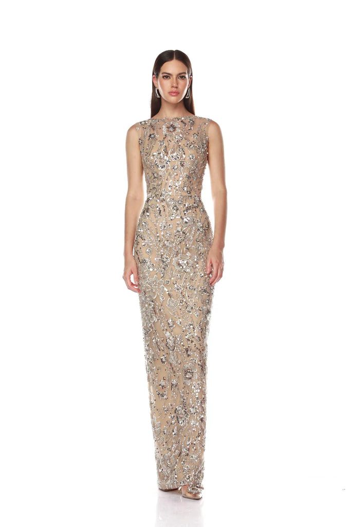 Make an entrance in the Violet Silver Maxi Dress—sleek, shimmering, and show-stopping.