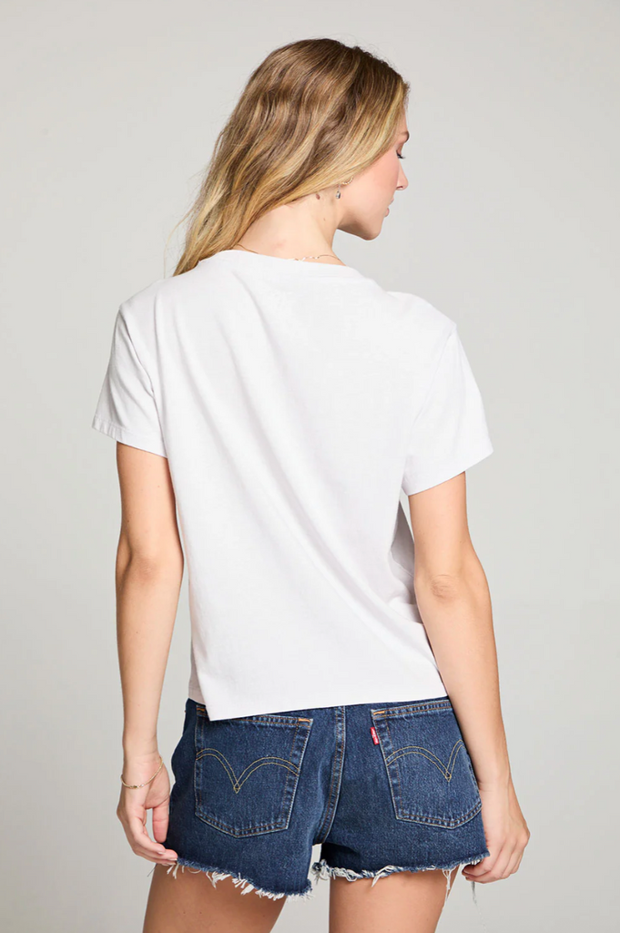 With its delicate font and rose design, this pearl white tee adds a touch of romance to your wardrobe.