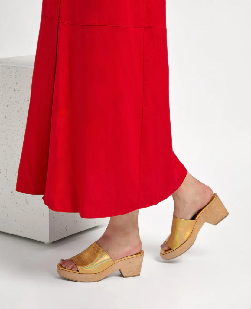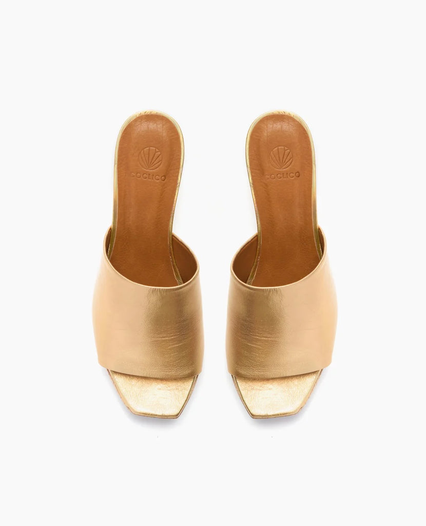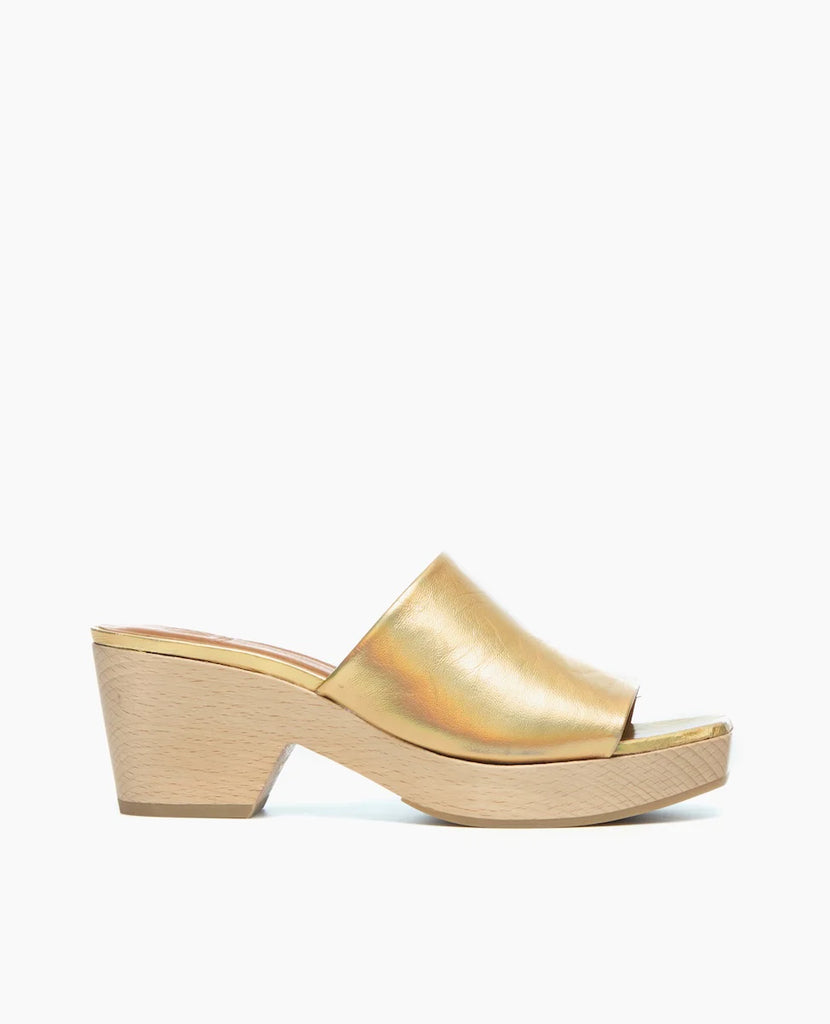 The Mist Clog has arrived, bringing fresh energy to the art of minimalist design. As the sandal sister of Coclico's beloved K series (think Kule and Kabuki), Mist carries on the tradition of every-detail-considered minimalism. A wide band of iridescent gold leather creates a striking yet understated silhouette, beautifully complemented by an angled squared-off toe. The solid ash wood base provides both stability and a natural lift, ensuring it feels as good as it looks. The Mist Clog enters the scene, breathing new life into a beloved silhouette and establishing itself as a surefire classic in the making.
