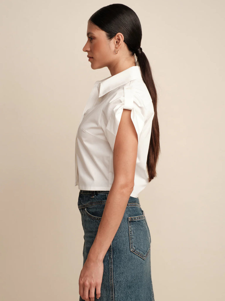Effortless Style with a Military Edge. Channel cool, laid-back vibes with the Leonora top. Crafted from crisp cotton poplin, this breezy piece features epaulettes on the short sleeves for a subtle nod to military style. It's the perfect blend of relaxed and refined, making it ideal for effortless everyday looks.