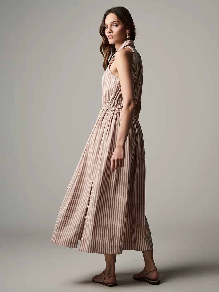 Crafted in cotton poplin with a softer, tencel finish, the Stella Dress in blush stripe pairs a relaxed fit, with an adjustable self-tie waist for a more tapered silhouette. Double slits on the side seams are accented with buttons that can be worn open or closed, flowing into an almost maxi-length, flattering hemline.
