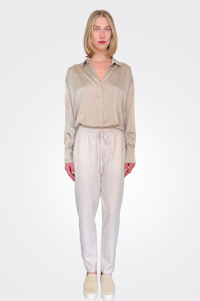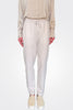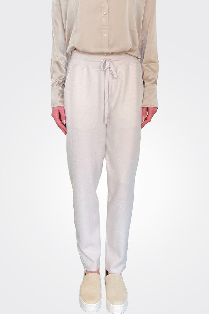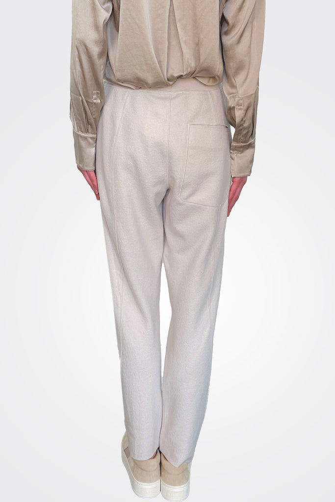 black, virgin wool blend, felted finish, seam detailing, elasticated drawstring waistband, two diagonal pockets to the sides, rear patch pocket, tapered leg