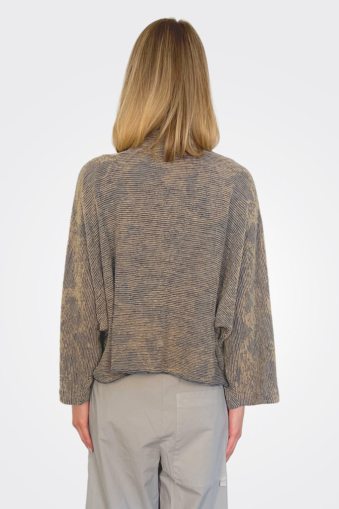 Featuring a soft lapel and a fluid silhouette, it drapes effortlessly for a flattering, relaxed fit. The richly textured fabric is brushed with painterly hues of yellow and blue, offering a unique, wearable statement piece