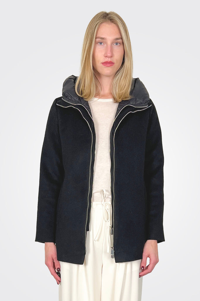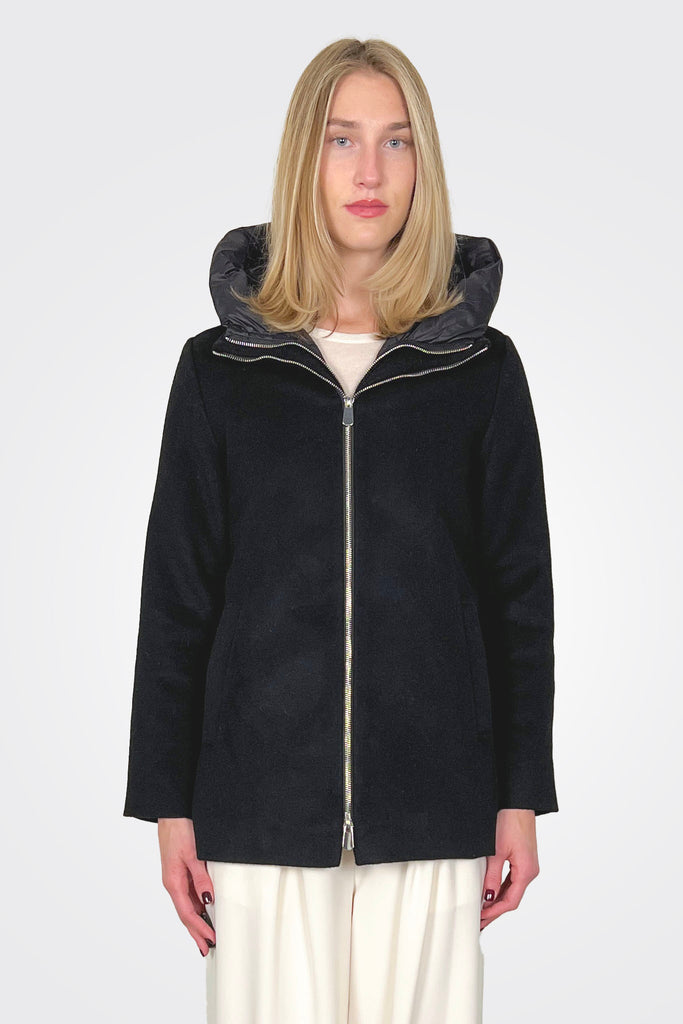 Short crushed broadcloth jacket with double zipper and interior with removable nylon hood.