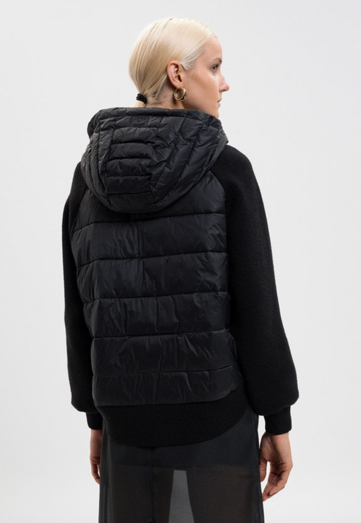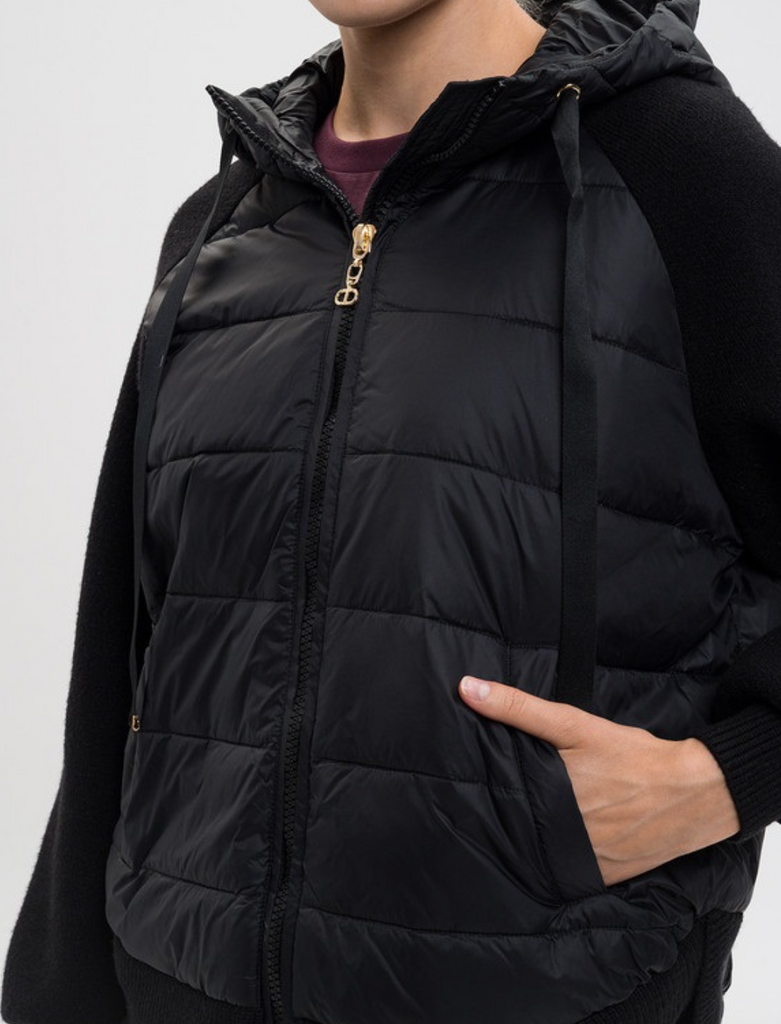 Padded jacket with drawstring hood, knitted details, zip fastening, Oval T zip puller and ribbed finishes.