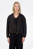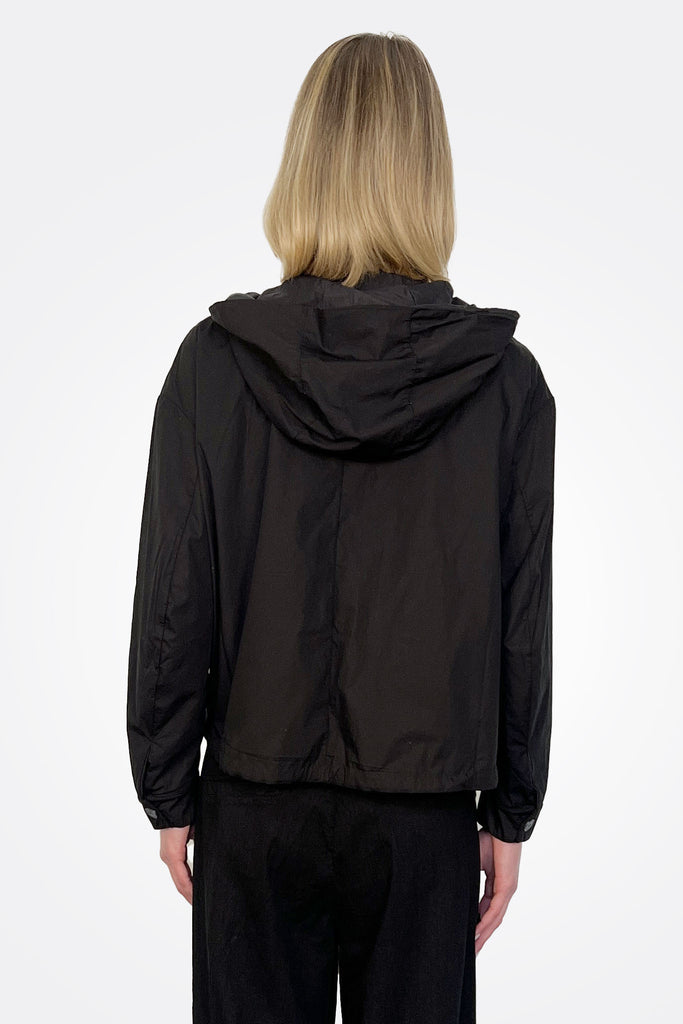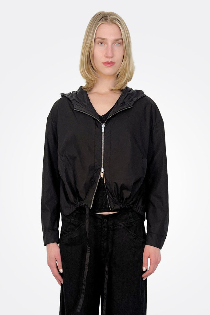 Short jacket with double-face hood with one side in cotton poplin and the other in silk blend. Zip closure, 2 welt pockets and drawstring at the bottom. Garment dyed.