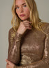 Polyester-spandex blend with a luxe metallic finish.