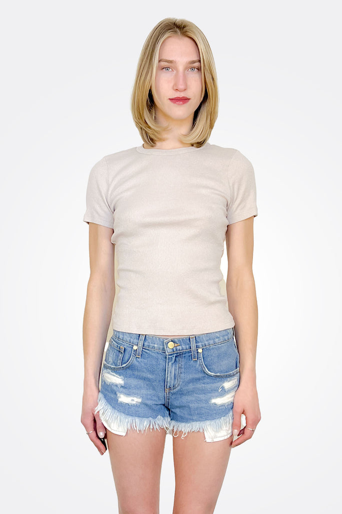 Laniis a shine crew neck tee. Made from signature Shine fabric that is form-fitting, soft, and gives a subtle sheen.