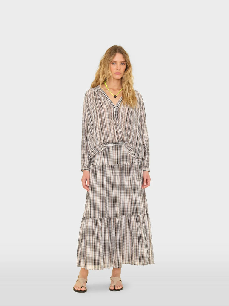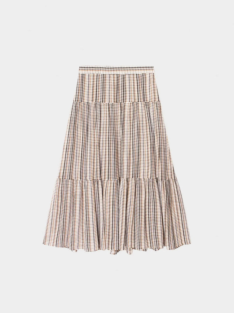 Pretty in Print. Alexia is new this season in our cotton confetti check print. This flowy tiered skirt features a flat front and elasticized back waist.