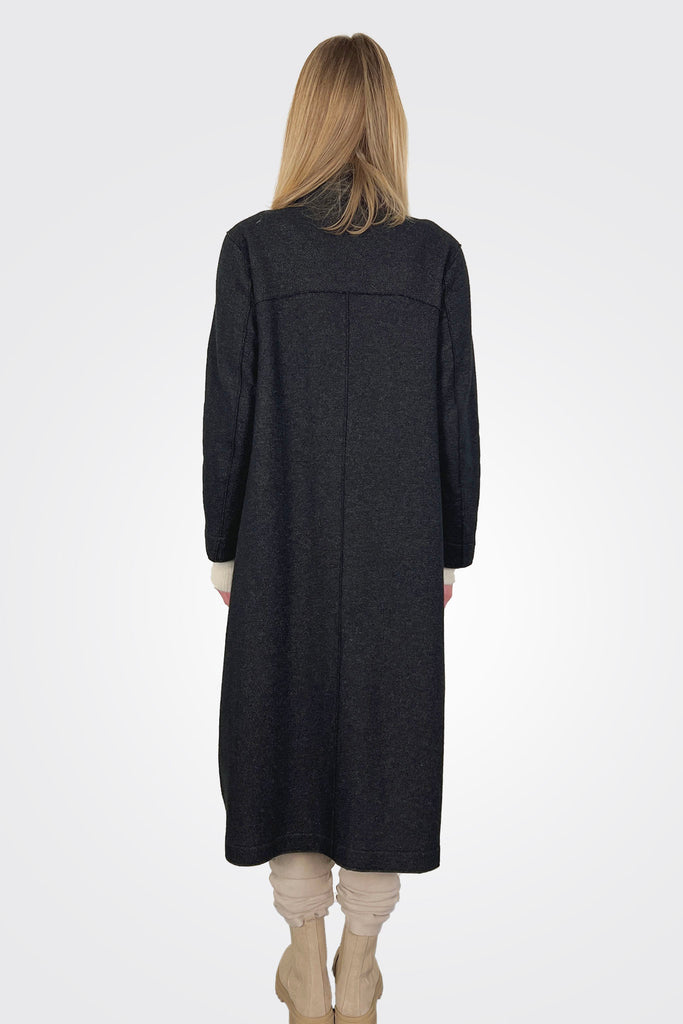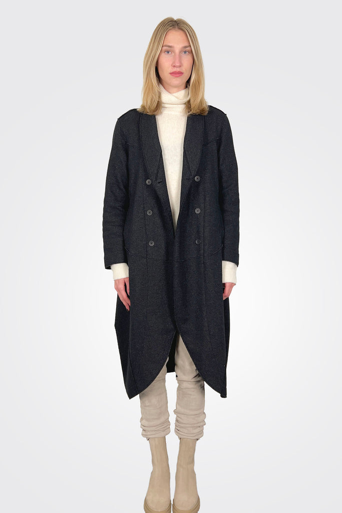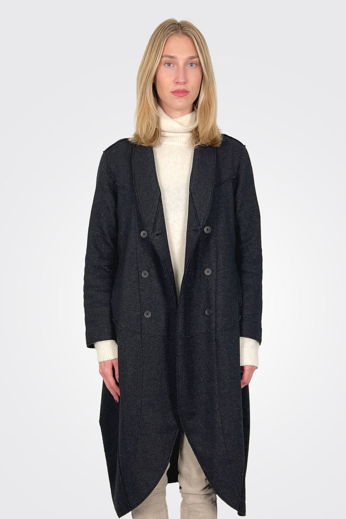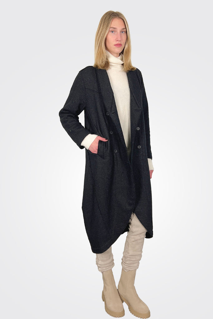 Unlined double-breasted coat made of knitted wool and viscose, with a herringbone pattern on one side. It has welt pockets, a shawl collar and stitching on the cuts. The distinctive cuts give the garment an original tulip-shaped fit.