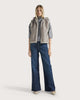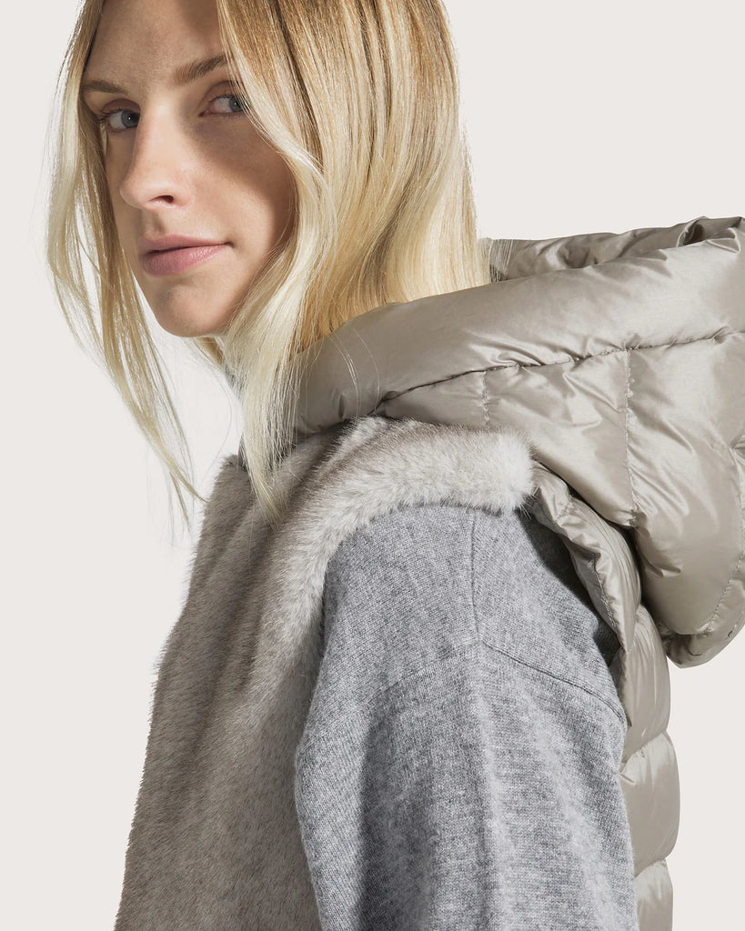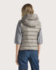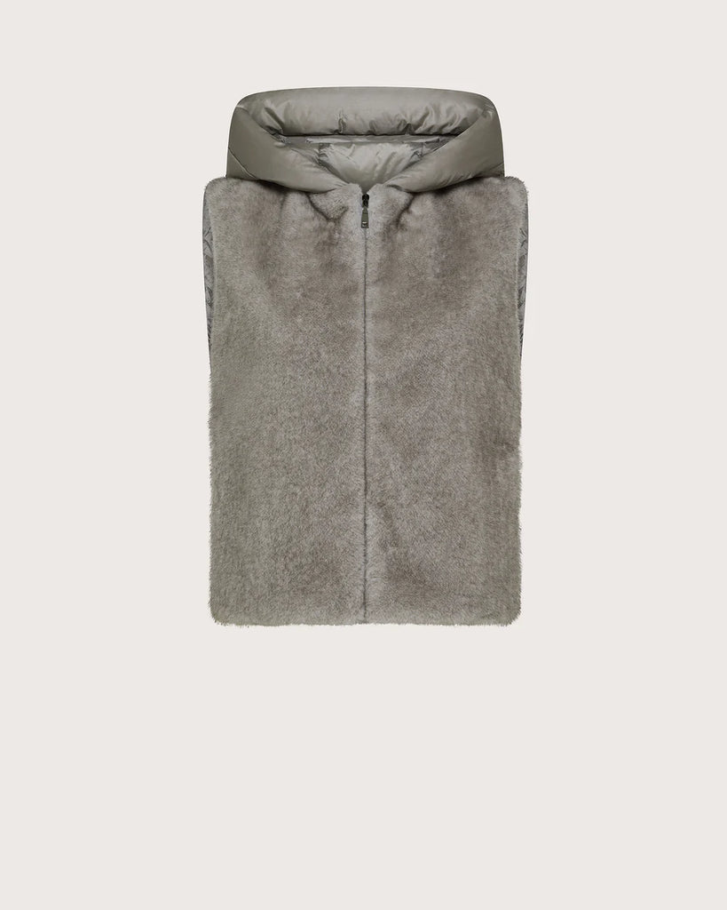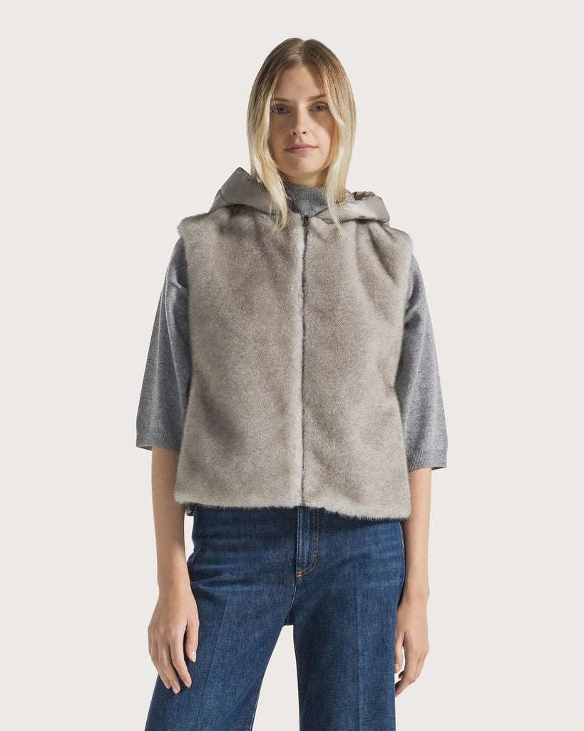 Padded hooded vest made of matte nylon. Front zipper fastening. Front in faux fur. Front pockets.