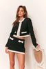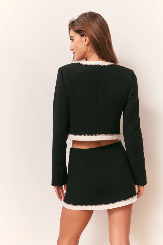 The Ralphette Jacket elevates classic tailoring with a touch of LoveShackFancy opulence. Crafted from smooth, structured twill, this tuxedo-inspired piece features refined contrast banding and sparkling rhinestone trim around the neckline and front sweep for a subtly glamorous finish. Pair with the Edeness Skirt for a full set.