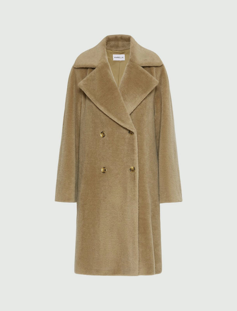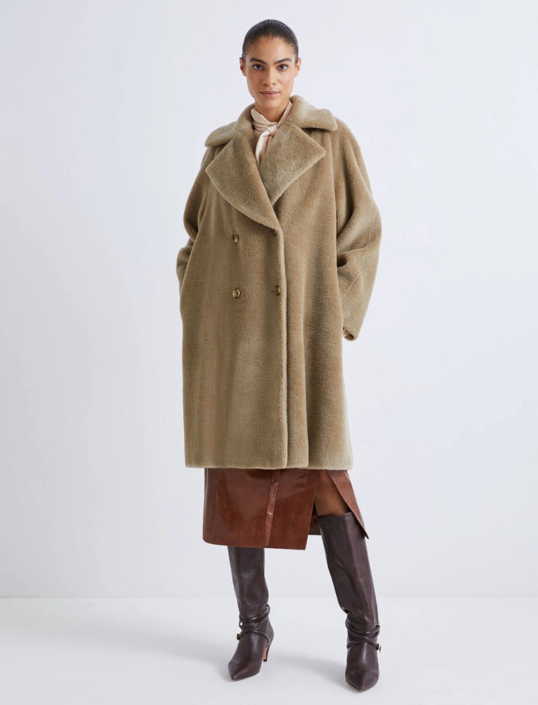 Nothing will cocoon you better than this wool knit fabric coat. The distinctive furry touch emphasises the richness of the material, whilst the double-breasted design adds a tailored touch.