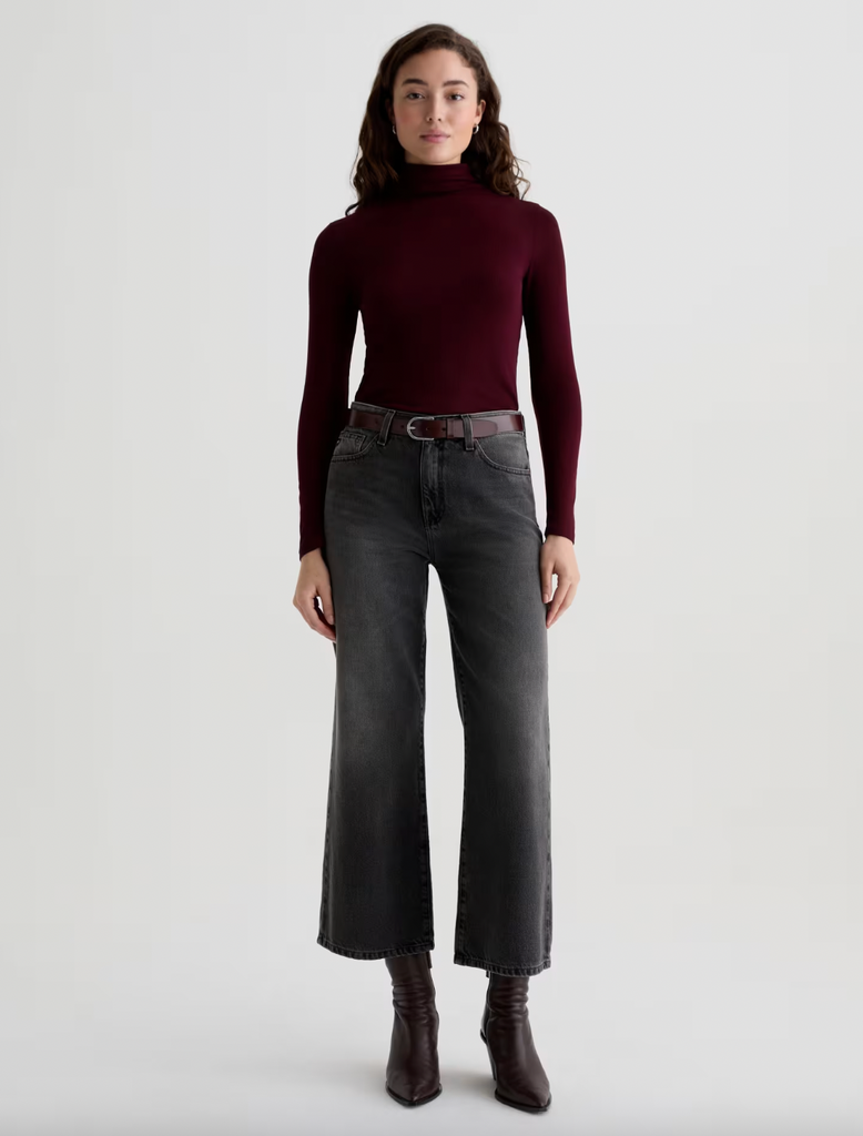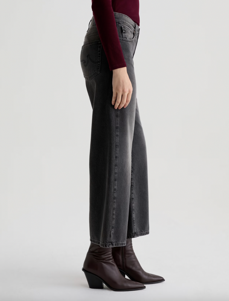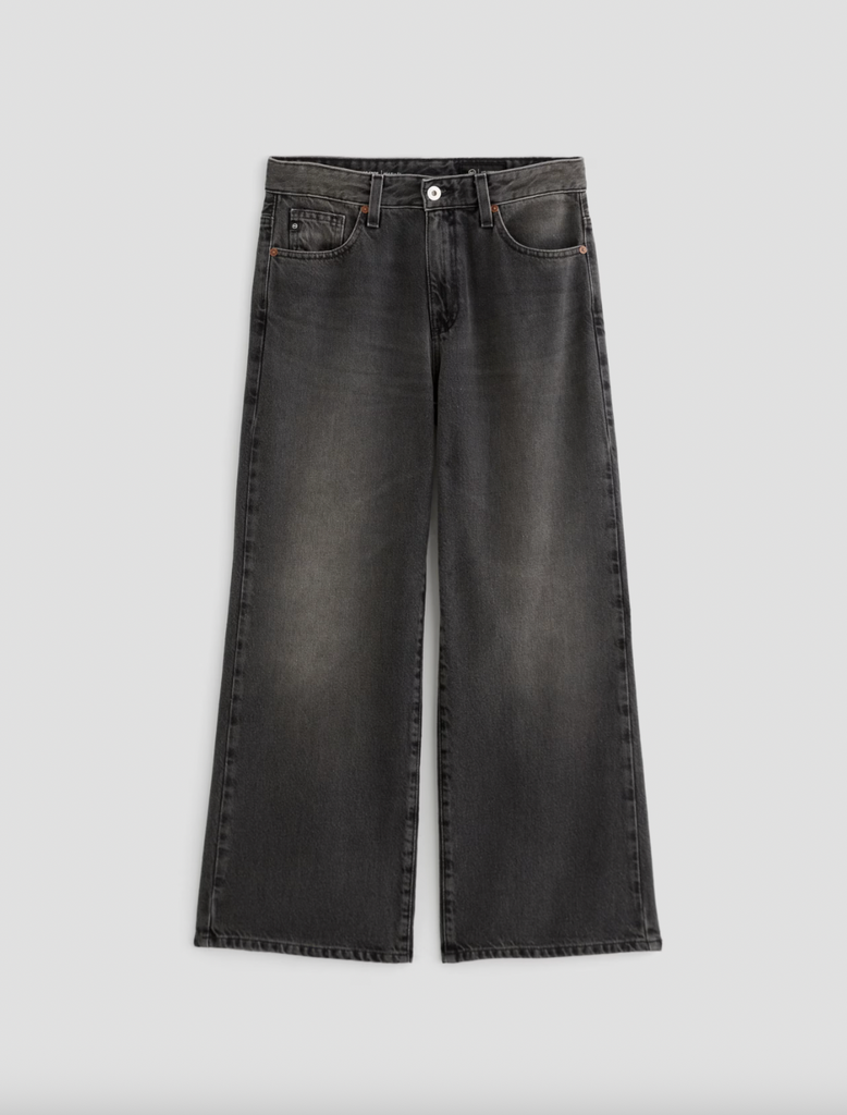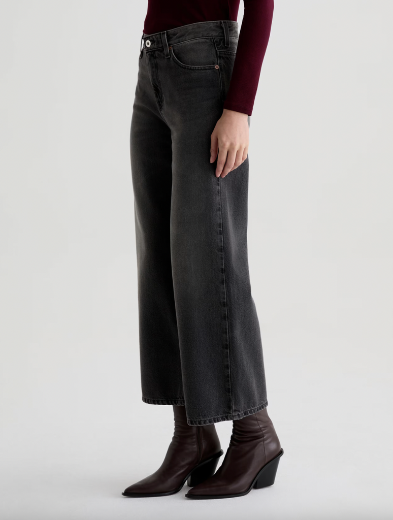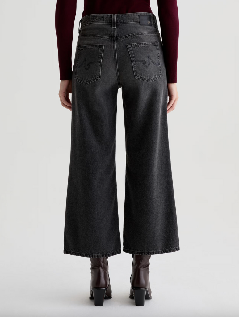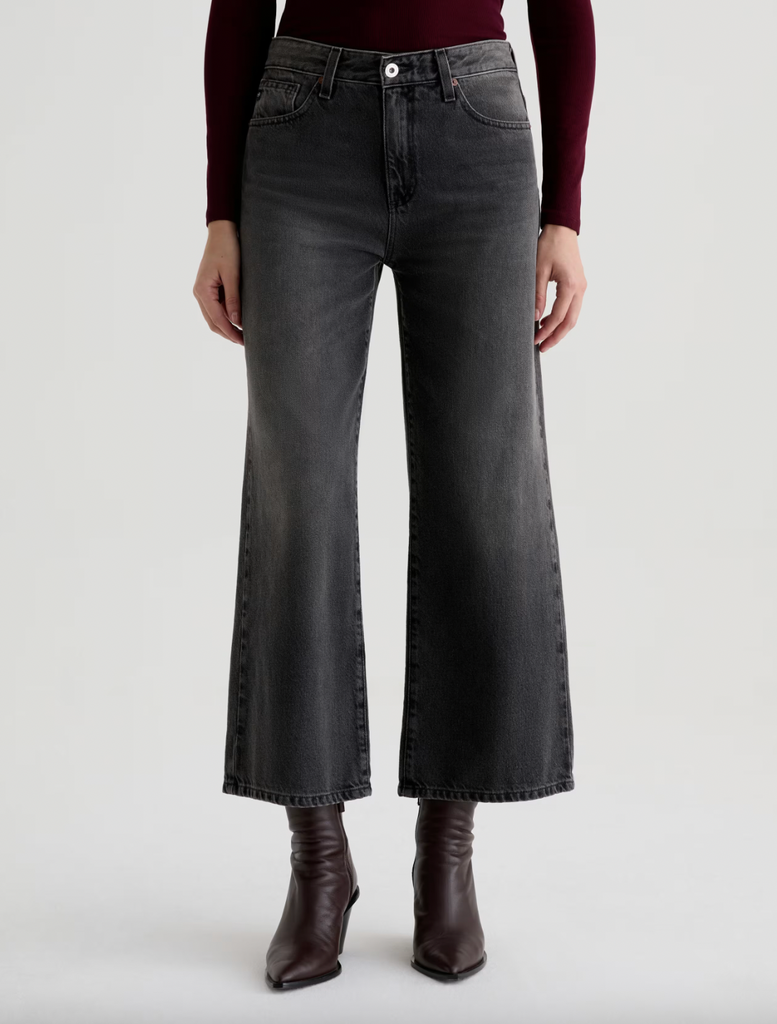 The Saige Wide Leg Crop is a mid-rise fit jean. Crafted from 11.25 oz. Organic Black Rigid Denim in a washed black hue. Designed with classic five-pocket styling and premium construction for everyday wear.