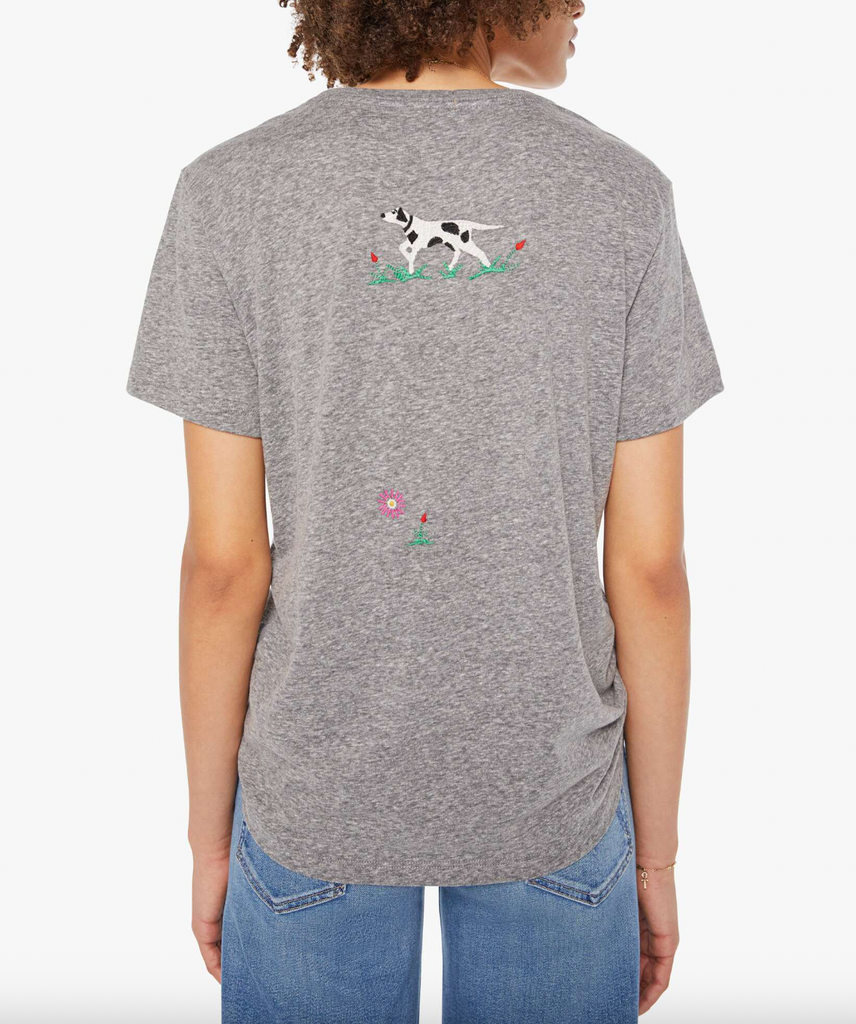 Run don't walk. A crewneck tee with an oversized fit and a clean hem. Made from a cotton blend, the heathered grey tee features yellow block text on the front and colorful embroidery throughout.