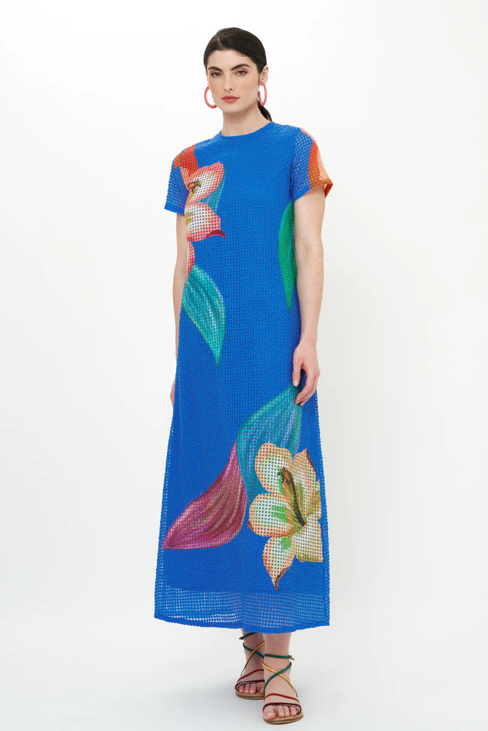 Transport yourself to the tropics with hibiscus flowers splashed across the brilliant blue background of this Short Sleeve Shift Maxi. Breezy open weave cotton provides a subtle texture and shine for an eye-catching effect.