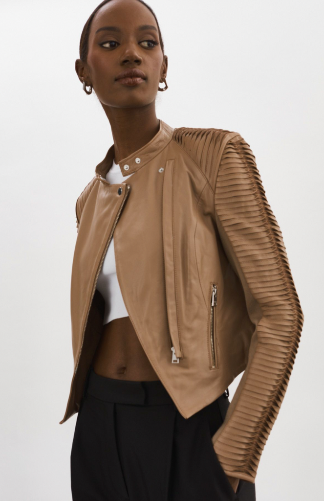 With its stunning textured sleeves, high neckline, and flawless fit, the Azra knows how to hold a gaze. At once subtle and eye-catching, this premium leather jacket refreshes the classic moto jacket in favor of a contemporary top-piece that brings any look to new, fashion-forward heights.