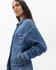 rb Miramar, our revolutionary printing technique, makes any material look like denim. This trucker jacket is cut and sewn from cotton terry cloth that's ultra-soft on the inside and printed on the outside to look like your favorite denim jacket. Featuring metal buttons, the relaxed, slightly cropped style further achieves its comfortable fit and feel with pockets and other details digitally printed on the fabric.