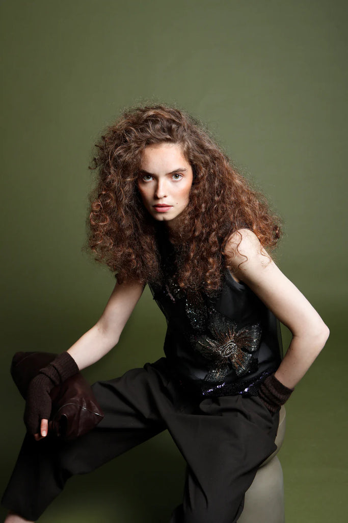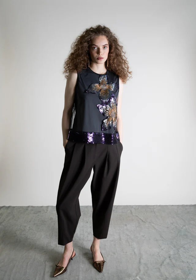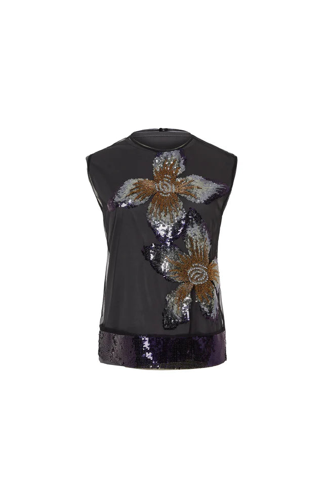 A tribute to dark luxury and restrained elegance, this sleeveless top crafted from sheer black tulle elevates the ethereal into a bold expression of contemporary sophistication. Structured yet lightweight, this piece dazzles with two large flowers embroidered in gold, silver, and purple sequins that flow fluidly from the chest to the side, creating a hypnotic, asymmetrical effect.