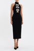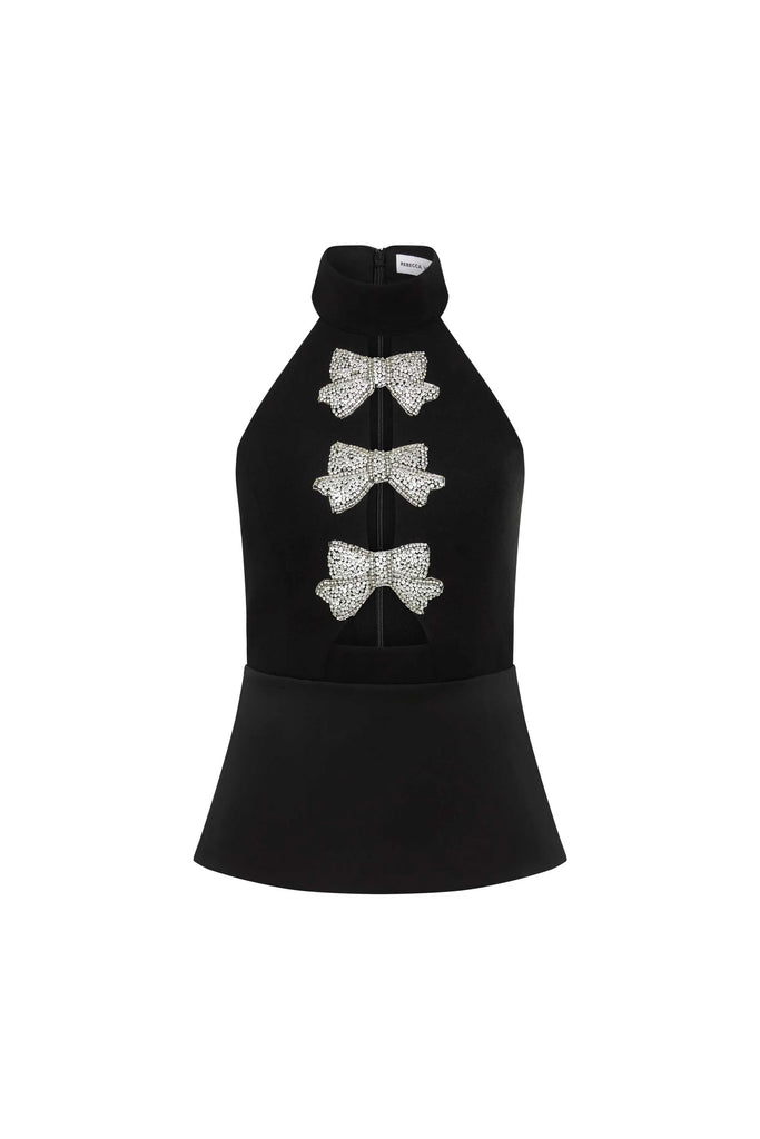 The Lita Top in black exudes glamour and sophistication. Tailored from bonded crepe, the halter neckline and front cut outs offer a feminine look, adorned with diamante embellished bows for a touch of opulence. Secured with a zip fastening at the back, this top is perfectly chic and stylish to pair with your wardrobe staples.