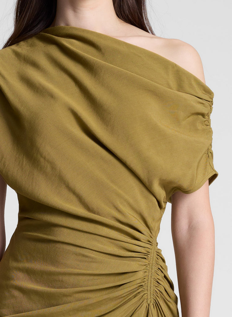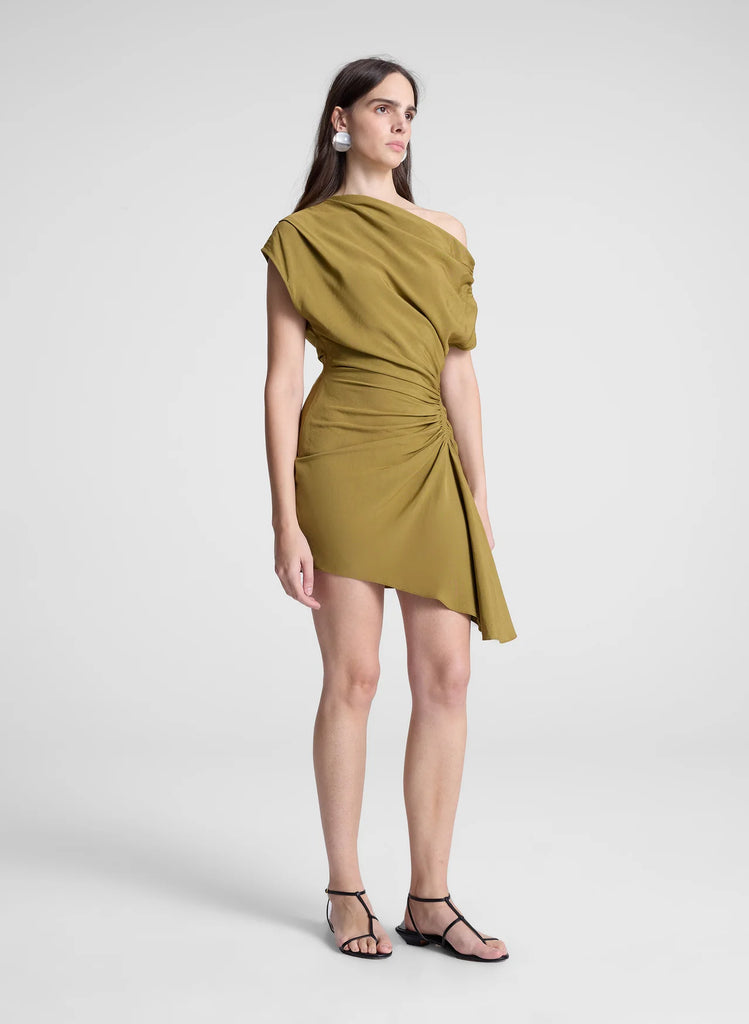 The Poppy Dress is crafted from our drapey linen-viscose blend—breezy yet structured fabric lends natural movement—in a warm, earthy hazel tone. Designed with a fluid, asymmetric silhouette, this off-the-shoulder mini features a softly draped neckline and artful ruching along the side that enhances its sculptural shape.