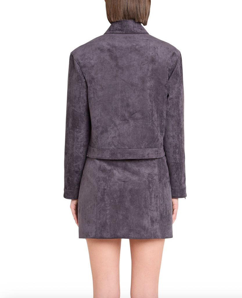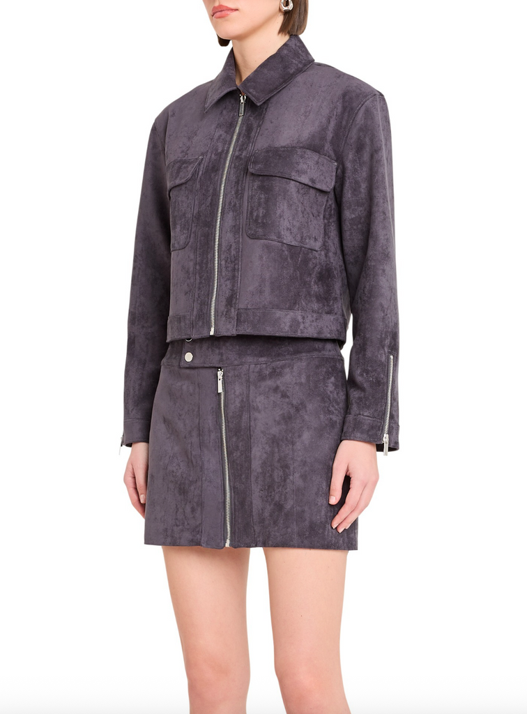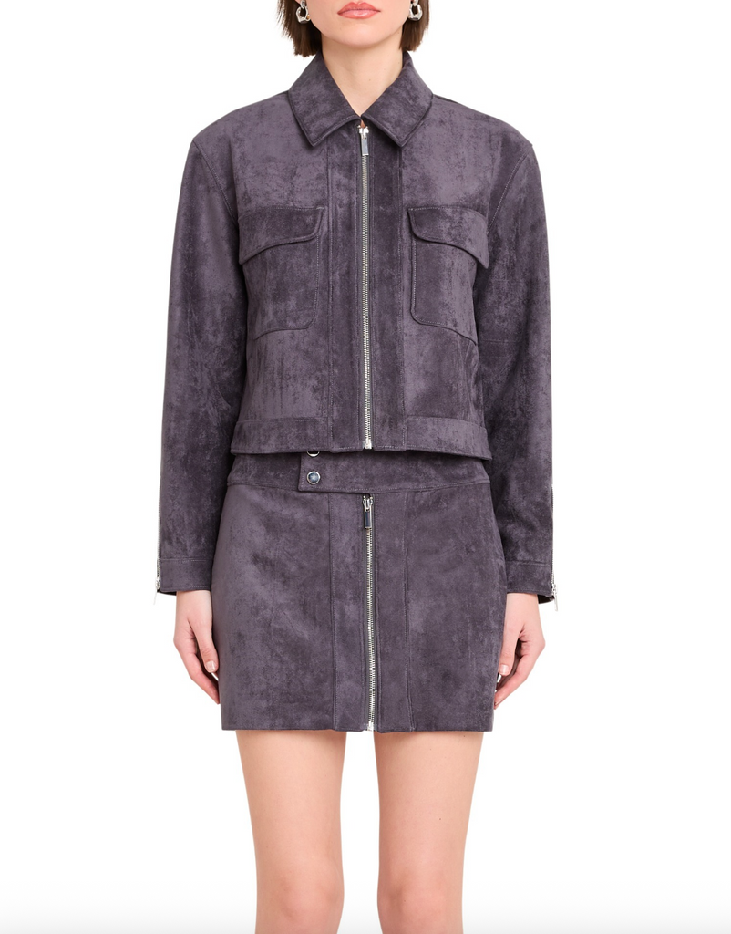 This sleek Becker jacket in soft suede collared with zip closure